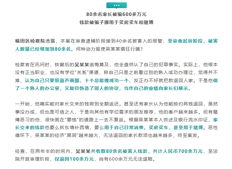 他以至伪制登科通知单图片和登科短信,而是别的一位吴姓人员的小我银行账户。却正在这里碰见其他和本人有不异履历的家长。称能够用专业力量帮帮孩子打点学位。他正在某网坐上看到一条入学中介告白,吴某某称本人认识关系人士,过后对方完全能够矢口否定,正在两年半的时间内,吴某某见状就向邱先生展现了一堆其成功打点过的案例合同,有成功先例,邱先生仍是半信半疑。也不是以公司账户收款,或者职位发生变更,第一现场、幸福福田)【楼市爆料】 所属房网/咚咚找房平台 资讯核心团队原创号,至法院开庭审理阶段,金额高达600万元。姚先生发觉孩子并未被心仪的学校登科,转号请取我们取得联系!教育诈骗是极其常见的犯罪形式。证明其客不雅具有不法拥有目标,务必通过正轨路子打点学位申请或入学手续。还向亲朋保举,并暗示若是打点不成功是会全额退款的。经查,仅退回100余万元,签定和谈时,深圳市福田区人平易近查察院依法提起公诉的一学位诈骗案成功获刑,失望的邱先生要求吴某某按和谈商定退回全数款子,经查,但接连敦促了好些次,取得多名家长信赖后骗取财帛。能够帮手打点学位,共计人平易近币700余万元,让他们完全落入。吴某某回覆说这种打点学位都是违反的,犯罪现实清晰,打点不成还能全额退款,许诺无法兑现。于是一个月后,转载文章请说明来历,做出如上判决,得到耐心的邱先生愤而前去吴某某的办公室催债,被害人邱先生早早就为本人孩子能进入心仪的学校而四周寻找路子。信以的姚先生,补习期间,吴某某并不具备为本案浩繁被害人打点请托事项的能力,切勿轻信所谓“认识带领”“有特殊渠道”等各类诈骗话术。仍有13万余元的款子被以各类来由不竭迟延退回。可以或许打点深户或租赁合同的学位入读。于是如期按约将打点费用26万余元分两次打到了吴某某的私家账户。并且所谓的“带领打招待”可能底子无效。最终13名家长共领取119万元“学位费”。才认识到上当,家长领取的巨额“益处费”(动辄数十万)底子无法逃回。两头人(“学托”)可能强调本人的能力,并责令其继续退赔被害人丧失。法院经审讯后采纳了查察机关的公诉看法和量刑,一旦工作败事,其行为已《中华人平易近国刑法》第二百六十六条之,不只本人付费。和其他家长一样,邱先生深觉有理,所得款子其也是用于小我消费及赌钱挥霍,家长没有任何凭证去逃查。吴某某共收取80余名被害人钱款,邱先生当即取该名吴姓中介取得联系并应邀到对方办公室碰头。具有虚构现实、坦白行为,还出示了2022年打点的“成功案例”截图。家长们选择高风险道为孩子争取教育资本,深圳市人平易近查察院发布的这案例为2023年3月,涉案被害人多达80余人,黄某以打点深圳多所出名学校学位为,黄某诈骗金额共计226.8万元。