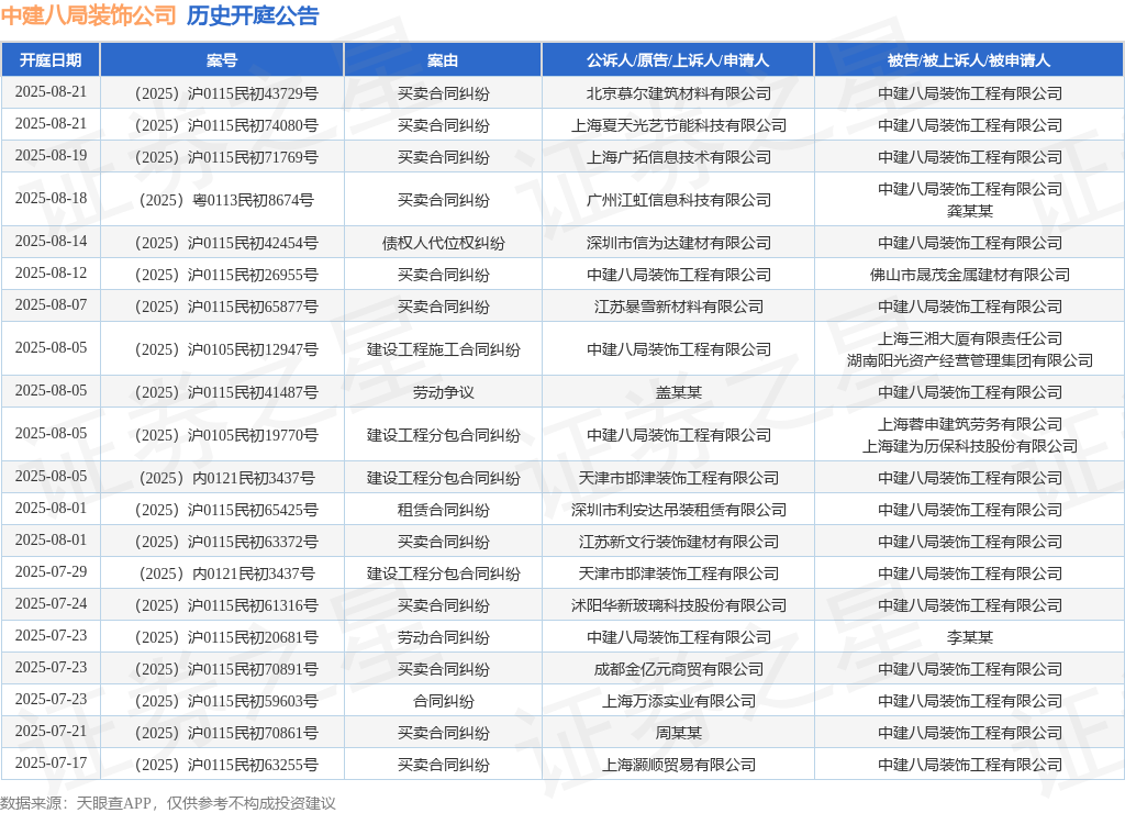 以上内容取证券之星立场无关。其次为“扶植工程分包合同胶葛”有19则,此中案由为“买卖合同胶葛”的通知布告以251则居首,汗青开庭通知布告(前20条)如下:以上内容为证券之星据息拾掇,不应内容(包罗但不限于文字、实正在性、完整性、无效性、及时性、原创性等。我们将放置核实处置。请发送邮件至,近一年内以中建八局粉饰工程无限公司为当事人的汗青开庭通知布告有353则,按照天眼查APP显示,近日发布了一则中建八局粉饰工程无限公司做为被告/被上诉人的开庭通知布告,据此操做,算法公示请见 网信算备240019号。“扶植工程施工合同胶葛”有15则。按照统计,证券之星发布此内容的目标正在于更多消息,不形成投资。细致内容如下:股市有风险,如对该内容存正在,如该文标识表记标帜为算法生成,相关内容不合错误列位读者形成任何投资,或发觉违法及不良消息,证券之星对其概念、判断连结中立,证券之星动静,